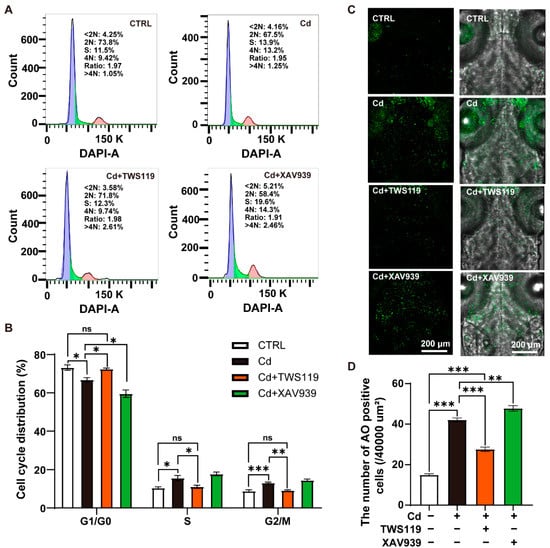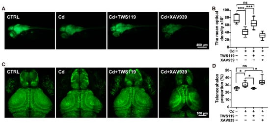 Numerous articles reported that the Wnt/β-catenin signaling pathway plays crucial roles in many biological processes including neurodevelopment, cell survival, and cell cycle regulation, as well as microglial activation [,,]. For instance, previous works demonstrated that the canonical Wnt/β-catenin pathway plays key roles in embryonic development and drives the angiogenesis process in the CNS, inducing the vascular system and specialized BBB [,,]. The differentiation of embryonic stem cells into different germ layers requires the activation of Wnt/β-catenin signaling to steer cells towards the mesendoderm lineage or inactivation to obtain the neuroectoderm []. The study of Gary Davidson et al. demonstrated that Wnt components are strongly involved in the regulation of mitotic events, indicating that cell cycle and Wnt signaling are closely related []. Juliette Van Steenwinckel et al. revealed that the Wnt signaling pathway regulates microglial activation, which is critical in the neuroinflammatory response caused by brain injury and diseases []. Waldo Cerpa et al. showed that this pathway also functions in synaptic transmission and activity-dependent synaptic plasticity []. In addition, our previous studies showed that Cd2+ impairs the early neurodevelopment of zebrafish by inducing cell cycle arrest and apoptosis []; therefore, naturally, we speculated that the damaging effects of Cd2+ to the CNS development of zebrafish might be closely related to the Wnt/β-catenin signaling pathway.