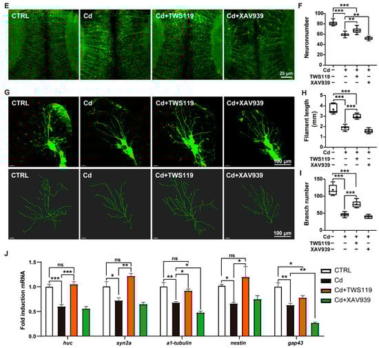 In order to explore the neural structure basis of the above neurobehavioral detection results, the neuron specifically labelled Tg(elavl3:EGFP) zebrafish line was applied and imaging was performed initially under the standard fluorescence microscope. The results showed that the fluorescence intensity of the brain and spine region in the 6 dpf larvae decayed in the Cd2+-exposed individuals, whereas this effect was significantly attenuated in the Cd2+ and TWS119 coexposed larvae (Figure 4A,B). Next, a finer and clearer structure of neurons was then obtained by using the in vivo two-photon neuroimaging. In accordance with our previous data, the area of telencephalon tended to be expanded in the Cd2+-exposed, as well as the Cd2++XAV939 co-exposed groups, while this teratogenic effect on the brain was significantly alleviated upon TWS119 cotreatment (Figure 4C,D). Moreover, in our recent study, we identified a significant decrease in the density of periventricular neurons in the tectal PVL (periventricular layer) region of the zebrafish larvae during developmental Cd2+ exposure. However, this distinct tendency towards neuron loss was significantly reversed by TWS119 cotreatment, and aggravated by XAV939 coexposure (Figure 4E,F). Next, for the purpose of further verifying the involvement of the Wnt signaling pathway in the Cd2+-affected zebrafish early neurogenesis, trigeminal ganglion neurons in 24 hpf embryos were also examined in detail via in vivo two-photon imaging. Interestingly, the structural complexity of the TG neurons was reduced upon Cd2+ exposure, whereas this effect was significantly restored in the Cd2++TWS119 cotreatment embryos, as indicated by our analysis of filament length and branch number (Figure 4G–I). To explore the molecular/genetic basis of the above imaging data, the expression profiles of genes including elavl3 (huc), nestin, α1-tubulin, syn2a, and gap43, which are closely involved in neuron development and differentiation, were detected by qRT-PCR analysis. As expected, the expression of these genes was significantly downregulated in Cd2+-exposed 6 dpf larvae, while this trend was remarkably reversed upon activation of the Wnt signaling pathway by TWS119 (Figure 4J). Thus, these results demonstrate that the Cd2+-modulated Wnt/β-catenin pathway contributes to the observed neurodevelopmental disorders.