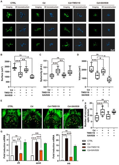 Our previous study demonstrated that Cd2+ induces microglia activation and neuroinflammation in the brains of zebrafish larvae. Given that the Wnt signaling pathway has been reported to significantly regulate neuroinflammatory responses [], we, thus, investigated the role of this pathway in Cd2+-induced microgliosis and neuroinflammation. Through in vivo two-photon imaging of the microglia-specific Tg(ApoE: EGFP) transgenic line, we observed and verified that upon Cd2+ exposure, the microglia in the brain of zebrafish larvae showed distinct branch retraction, changing their morphology from ramified to amoeboid, which is a typical morphological change of microglia activation and neuroimmune response. Compared with the Cd2+ exposed larvae, the microglia in the Cd + TWS119 group tended to possess longer branches and were more like those in the normal control group, while the microglia in the Cd + XAV939 group remained amoeboid (Figure 6A). According to the quantitative statistics of their morphologic parameters, we found that in comparison to the Cd2+-exposed group, the surface area and volume of microglia were significantly increased in the Cd + TWS119 group, and reduced in the Cd + XAV939 group, while the statistics for sphericity showed the exact opposite trend, indicating that activation of the Wnt signaling pathway can inhibit the activation of microglia (Figure 6B–D). In addition, during the 6-day exposure to Cd2+, an induction of microglia density was also observed in the midbrain optic tectum of the zebrafish larvae. However, this Cd2+-induced microgliosis was significantly repressed upon TWS119 coexposure (Figure 6E,F). Finally, the expression patterns of genes related to microglia development and inflammatory responses were determined by qRT-PCR analysis. Irf8, a crucial gene for microglia development, and apoeb, a typical microglia marker gene, as well as the gene encoding proinflammatory factor tnf-α, were all significantly upregulated by Cd2+ exposure. However, these inductive effects were significantly attenuated by the activation of the Wnt signaling pathway via TWS119 treatment (Figure 6G). Together, our results suggest that the Wnt signaling pathway is strongly implicated in microglia polarization and proliferation, as well as their mediated neuroinflammatory response.