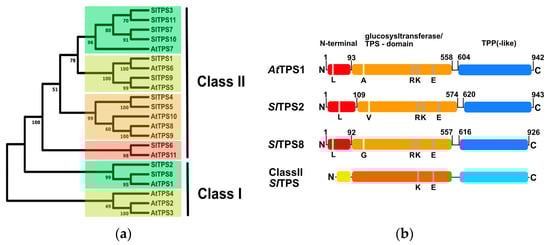 Comparison of the TPS families of tomato and Arabidopsis. (a), Phylogenetic tree of the TPS-families from tomato and Arabidopsis inferred using the Neighbor-Joining method. The bootstrap consensus tree inferred from 500 replicates. Evolutionary analyses were conducted in MEGA11 (www.megasoftware.net, accessed on 24 July 2022) (b), Domain structure of tomato class I TPS proteins in relation to Arabidopsis TPS1. For comparison, the general domain structure of tomato class II TPS proteins is indicated. Domains were predicted using the InterPro online tool (https://www.ebi.ac.uk/interpro/, accessed on 1 August 2022).