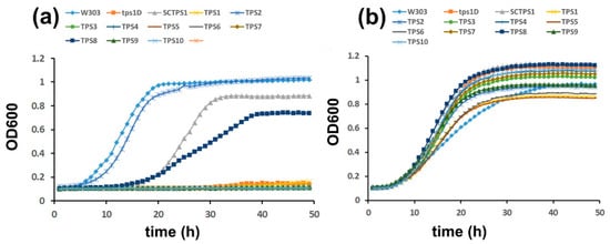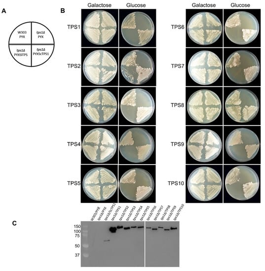 - De Virgilio, C.; Bürckert, N.; Bell, W.; Jenö, P.; Boller, T.; Wiemken, A. Disruption of TPS2, the gene encoding the 100-kDa subunit of the trehalose-6-phosphate synthase/phosphatase complex in Saccharomyces cerevisiae, causes accumulation of trehalose-6-phosphate and loss of trehalose-6-phosphate phosphatase activity. Eur. J. Biochem. 1993, 212, 315–323. [Google Scholar] [CrossRef] [PubMed]