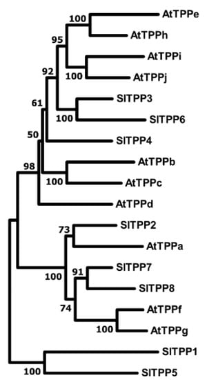 Phylogenetic tree of the TPP-families from tomato and Arabidopsis inferred using the Neighbor-Joining method. The bootstrap consensus tree inferred from 500 replicates. Evolutionary analyses were conducted in MEGA11 (www.megasoftware.net, accessed on 24 July 2022).