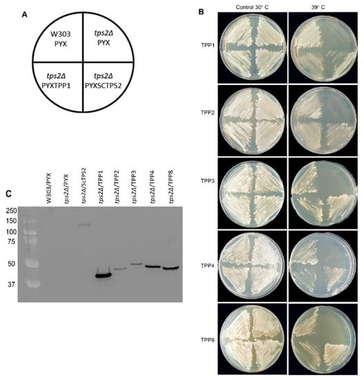 All tomato TPP isoforms tested display heterologous trehalose-6-P phosphatase (TPP). (A) Layout of growth plates. (B) Complementation of the yeast Δtps2 growth defect at 39 °C. Growth at 30 °C served as a control. (C) Verification of protein expression in the individual yeast strains by immunoblotting using an anti-HA antibody. The experiment has been repeated three times with three independent plates each, yielding similar results. Representative images are shown here.