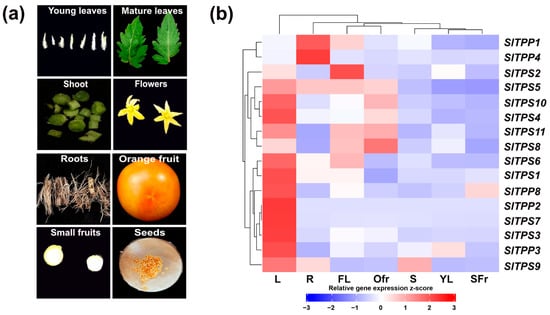 Tissue-specific expression of tomato TPS/TPP genes. (a) Representation of tissues sampled for RNA extraction. (b) Heatmap of gene expression. L = mature leave; R = root; FL = flower; Ofr = orange fruit; S = stem; YL = young leave; SFr = small fruit. The experiment was carried out at least three times with similar results.
