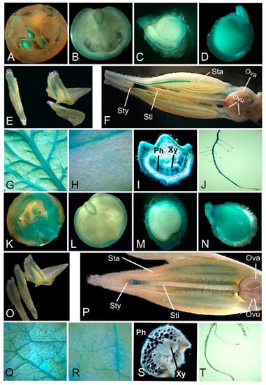 - Jefferson, R.A.; Kavanagh, T.A.; Bevan, M.W. GUS fusions: Beta-glucuronidase as a sensitive and versatile gene fusion marker in higher plants. EMBO J. 1987, 6, 3901–3907. [Google Scholar] [CrossRef] [PubMed]