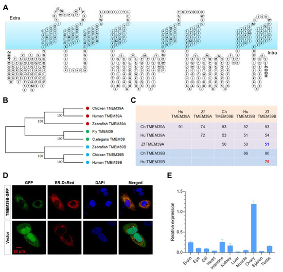 Molecular characteristics of zebrafish Tmem39b. (A) Predicted structure of zebrafish Tmem39b protein, which contains 8 transmembrane domains. (B) A phylogenetic tree of TMEM39 proteins from the representative species. (C) Sequence identity between the TMEM39 proteins of several vertebrate species. (D) GFP-tagged zebrafish Tmem39b localizes to the endoplasmic reticulum. (E) Distribution of tmem39b transcripts in the tissues of adult zebrafish.