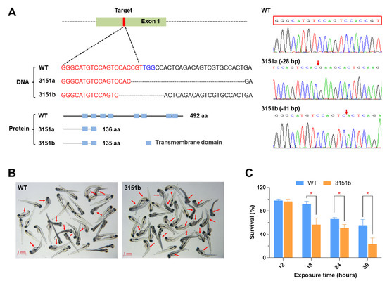 To investigate the functions of zebrafish Tmem39b in regulating cold resistance, the gene knock-out fish lines were first generated using the CRISPR/Cas9 system. Two knockout zebrafish lines were obtained and submitted to the China Zebrafish Resource Center (CZRC). The accession numbers of the mutant lines were zko3151a (3151a, −28 bp) and zko3151b (3151b, −11 bp), respectively. The genotypes of the mutant lines were confirmed using DNA sequencing. The mutations result in the frame shift and truncation of the encoded protein (Figure 2A). The mutants were viable and fertile, and demonstrated no defects in embryogenesis and early development (Figure S1A). Interestingly, adult males of zko3151b had a significantly lower standard length (p < 0.01) and body weight (p < 0.01) in comparison to the wild-type (WT) males (Figure S1B).