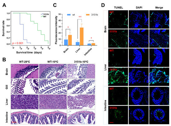 To explore the effects of cold exposure on tissue structure, adults of both the WT and 3151b mutant were exposed to 10 °C for 2 d and the survivors were dissected. Tissues, including the brain, gill, liver, and intestine, were collected. Sample fixation, paraffin section, and hematoxylin and eosin (H&E) staining were performed as previously described [64]. The tissues obtained from an untreated WT fish were also included. Images for the sections were captured using an Aperio VERSA Brightfield, Fluorescence & FISH Digital Pathology Scanner from Leica (Wetzlar, Germany).