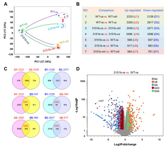 The results of principle component analysis (PCA) reveal an obvious separation between the zko3151b-re and WT-re samples, while the ctrl and cs samples of the mutants are clustered together with those of WT (Figure 4A), suggesting severe effects of the tmem39b mutation on gene transcription during the rewarming phase. Numbers of the differentially expressed genes (DEGs) between different experimental groups are displayed in Figure 4B. The changes between treatment conditions elicited a high number of DEGs in both the mutant and WT larvae. For example, the exposure of the WT larvae to cold stress resulted in 2333 up-regulated (U1) and 2129 down-regulated (D1) genes; while recovery at 28 °C caused the up-regulation of 3350 (U2) and down-regulation of 2917 genes (D2), respectively (Figure 4C). DEG numbers for the zko3151b mutants were always slightly higher than those of the WT under the same condition. In agreement with the PCA results, the highest numbers of both up- and down-regulated genes between the mutant and WT were observed during the rewarming phase.