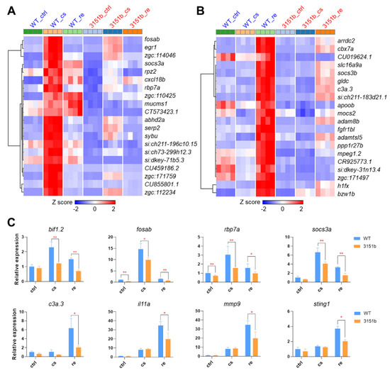 The genes of GS1 and GS3 were ranked according to the significance (adjust p-value) of differential expression, and the top ones are displayed in Figure 5A,B, respectively. Genes of GS1, such as fosab and egr1, are commonly identified cold-induced transcription factors, which are implicated in regulating the establishment of cold resistance [19,20,23]. Their transcriptional expressions were highly induced by cold stress, while the up-regulation was significantly attenuated in the zko3151b mutants (Figure 5A). Genes, such as c3a.3, il11a, mmp9, and sting1, are the representatives of GS3. These genes are associated with immune functions. Their up-regulation was exclusively detected in the rewarming phase and again dependent on the function of Tmem39b (Figure 5B). Tmem39b-dependent up-regulation of the representative genes belonging to GS3 (bif1.2, fosab, rbp7a, and socs3a) and GS4 (c3a.3, il11a, mmp9, and sting1) was also confirmed by qPCR assays (Figure 5C). Simultaneously, the loss of tmem39b leads to considerable effects on the expression of both cold- and rewarming-responsive genes.
