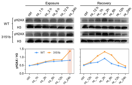 Western blotting was performed, as previously described [23], to detect the level of phosphorylated gamma H2A.X (S139). Both the WT and 3151b larvae (at 96 hpf) were exposed to 10 °C for 1, 2, 6, 12, and 24 h, or treated at 10 °C for 12 h followed by recovery at 28 °C for 1, 2, 6, 12, and 24 h as described above. At the indicated time points, a trichloroacetic acid solution (final concentration 4%) was added into the plates to immediately terminate life activity of the fish. The samples were collected in 1.5 mL centrifuge tubes, washed twice with pre-chilled acetone, and once with PBS. Subsequently, the samples were homogenized in SDS Lysis Buffer from Beyotime (Shanghai, China) supplemented with protease inhibitor cocktail (1:100) and PMSF (1:100); both were obtained from Beyotime (Shanghai, China). The lysate was centrifuged at 4 °C, 12,000× g for 10 min. The supernatant was collected and subjected to a protein-concentration measurement using a BCA Protein Assay Kit (Beyotime, Shanghai, China). A 1× sample buffer was added to the samples; they were boiled for 8 min and stored at -20 °C until use.