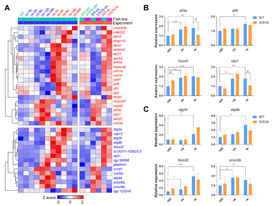 Both ER stress response and autophagy are important for enhancing the resistance of fish to the cold [23,37,38,50]. TMEM39A, the paralog of TMEM39B, is involved in the regulation of ER stress response and autophagy [44,45]. We analyzed the transcriptomic data to verify whether the mutation of zebrafish tmem39b affects the transcription of genes involved in ER stress response and autophagy. Our previous dynamic transcriptomic data of zebrafish larvae exposed to cold-warm stress revealed the genes involved in ER stress response and autophagy [23]. The ER stress response-associated genes (Figure 7A, presented in red) were classified into two clusters: genes including hspa5, atf4a, and xbp1 were induced following exposure to cold stress for more than 6h, while those, such as derl1, sec63, and atf6 were exclusively up-regulated upon rewarming. The up-regulation of genes involved in autophagy (Figure 7A, presented in blue) usually initiated after 24 h of cold exposure and lasted for 12 h upon recovery at 28 °C.
