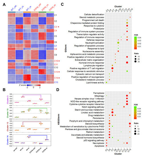 The DEGs were classified into 15 clusters through K-means clustering to identify the gene modules associated with functions of Tmem39b in regulating stress resilience. Among the gene clusters, C3, C4, C8, C10, C11, C13, and C14 were responsive to cold-warm stress and affected by tmem39b mutation; C7 and C15 were exclusively influenced by tmem39b mutation; and the others were only responsive to cold-warm stress (Figure 8A). The eigengenes for modules C3, C10, C13, and C14 were calculated to further illustrate their differential expressions between the mutants and WT under different conditions. Genes of C3 and C13 were mainly differentially expressed between 3151b-cs and WT-cs, while those of C10 and C14 were differentially expressed between 3151-re and WT-re (Figure 8B).
