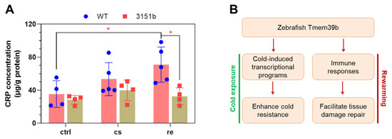 To provide further evidence for the roles of Tmem39b in regulating stress-induced immune functions, we measured the concentration of CRP of both the mutant and WT larvae exposed to cold-warm stress. CRPs are secreted immune factors, which function as pattern-recognition receptors to bind the pathogens and apoptotic cells to facilitate their clearance by phagocytes [51]. The up-regulation of the crp2 gene by rewarming following cold exposure was highly Tmem39b-dependent (Figure 4D). Consistent with the transcriptomic data, only the WT larvae demonstrated a significant induction of tissue CRP concentration upon rewarming at 28 °C (Figure 9A). These results suggest that Tmem39b plays an important role in mediating production and secretion and the CRPs.