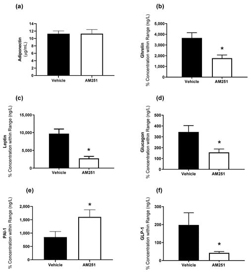 While we have previously demonstrated no change following AM251 treatment in glucose homeostasis as measured by Glucose Tolerance Tests (GTTs) and Insulin Tolerance Tests (ITTs) [] we were interested in whether AM251 altered plasma levels of adiponectin, leptin, glucagon, PAI-1, GLP-1, and ghrelin. While AM251 did not alter plasma adiponectin levels (Figure 1a), ghrelin, leptin, glucagon, and GLP-1 were significantly decreased, and PAI-1 levels were significantly increased with AM251 treatment (Figure 1b–e; p ≤ 0.05).