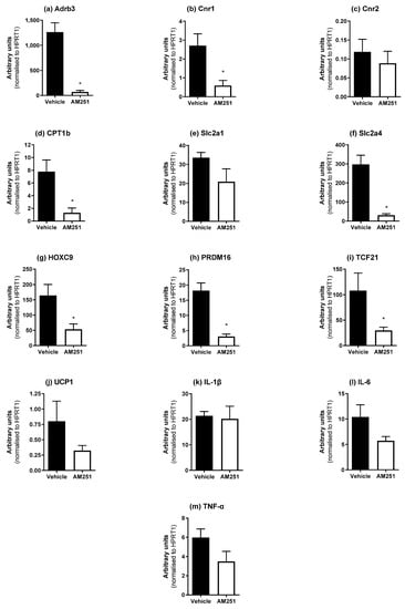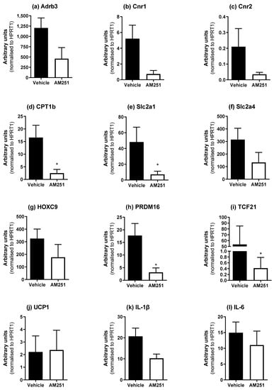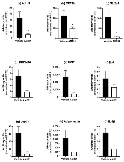 Effect of AM251 treatment in HFD rats on peri-renal WAT mRNA expression. HFD rats were injected daily with either AM251 (3 mg/kg of body weight, ip) or vehicle for six weeks. All results are presented as a mean ± SEM in arbitrary units (normalized to housekeeping gene HPRT1) from n = 4 (AM251) and n = 8–10 (vehicle) treated rats on an HFD. Significance * p ≤ 0.05 compared to vehicle.