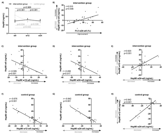 Plasma Hsp90 levels in patients with idiopathic inflammatory myopathies treated with standard-of-care pharmacotherapy (control group, CG, n = 23) or with additional non-pharmacological intervention (intervention group, IG, n = 27) for 24 weeks. (A) Differences in plasma Hsp90 levels over 24 weeks in both IG and CG (lines represent the mean, whiskers represent the standard error of the mean). (B) An increase in plasma Hsp90 levels over 12 weeks predicted an improvement in muscle endurance assessed by Functional Index-2 (FI-2) over the entire 24-week intervention. Lower baseline plasma Hsp90 levels in IG predicted an increase in plasma Hsp90 over weeks 0–12 (C) and 0–24 (D). (E) An increase in plasma Hsp90 levels over weeks 0–12 in IG predicted an increase in plasma Hsp90 over weeks 0–24. Higher baseline plasma Hsp90 levels in CG predicted a decrease in plasma Hsp90 over weeks 0–12 (F) and 0–24 (G). (H) A decrease in plasma Hsp90 levels over weeks 0–12 in CG predicted a decrease in plasma Hsp90 over weeks 0–24. W, week.