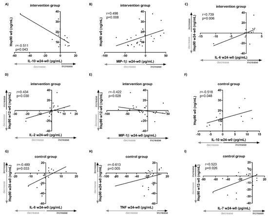 Associations of changes in systemic levels of Hsp90 and selected inflammatory cytokines/chemokines in patients with idiopathic inflammatory myopathies treated with standard-of-care pharmacotherapy (control group, CG, n = 23) or with additional non-pharmacological intervention (intervention group, IG, n = 27) for 24 weeks. Lower baseline plasma Hsp90 levels in IG predicted an increase in serum IL-10 (A) and a decrease in MIP-1β (B) over weeks 0–24. (C) Changes in plasma Hsp90 levels in IG over weeks 0–24 correlated positively with changes in serum IL-6 over weeks 0–24. Changes in plasma Hsp90 levels in IG over weeks 0–12 correlated positively with changes in serum IL-2 (D) and negatively with MIP-1β (E) over weeks 0–24. (F) Lower baseline plasma Hsp90 levels in CG predicted a decrease in serum IL-10 over weeks 0–24. Changes in plasma Hsp90 levels in CG over weeks 0–24 correlated positively with changes in serum IL-8 (G) and TNF (H) over weeks 0–24. (I) Changes in plasma Hsp90 levels in CG over weeks 0–12 correlated positively with changes in serum IL-7 over weeks 0–24. W, week.