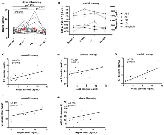 Systemic levels of Hsp90 and selected traditional markers of muscle damage and inflammation in healthy volunteers (n = 18) upon strenuous exercise. Systemic levels of Hsp90 (A) and of AST, ALT, CK, LD, and myoglobin (B) from baseline to 14 days after the intervention. Baseline plasma Hsp90 levels correlated positively with baseline serum levels of CK (C), ALT (D), and IL-4 (E). Plasma Hsp90 levels at 30 min correlated positively with serum levels of myoglobin (F) and MCP-1 (G) at 30 min. The red line (A) and the black/gray lines (B) represent the mean and the whiskers (A,B) represent the standard error of the mean.