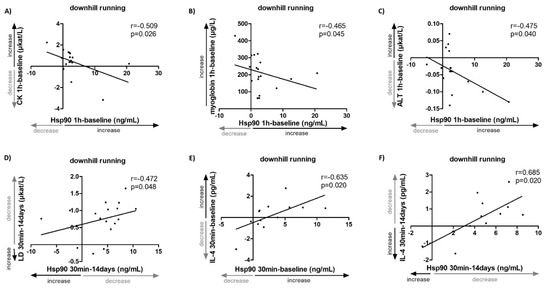 Associations of changes in systemic levels of Hsp90, traditional markers of muscle damage and inflammation in healthy volunteers (n = 18) upon strenuous exercise. The change in plasma Hsp90 from baseline to 1 h was inversely correlated with change from baseline to 1 h in serum levels of CK (A), myoglobin (B), and ALT (C). (D) A decrease in Hsp90 from 30 min to 14 days was associated with a decrease in LD from 30 min to 14 days. (E) An increase in Hsp90 from baseline to 30 min was associated with an increase in IL-4 from baseline to 30 min. (F) A decrease in Hsp90 from 30 min to 14 days was associated with a decrease in IL-4 from 30 min to 14 days.