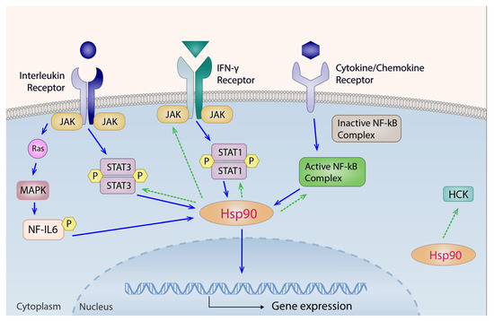 Signaling pathways of Hsp90 in the inflammatory process. Solid blue arrows indicate signaling pathways that upregulate Hsp90 expressions in the inflammatory process. IL-6 upregulates Hsp90 via both the JAK-STAT3 and the NF-IL6 pathways. INF- γ increases Hsp90 expressions through the JAK-STAT1 pathway. Other cytokines/chemokines such as TNF and IL-1 can upregulate Hsp90 by activating the NF-kB complex. Dashed green arrows denote relevant pathways influenced by Hsp90. Hsp90 binds and stabilizes JAK and STAT proteins, as well as the nonreceptor tyrosine kinase HCK, which is known to regulate innate immune response. Reciprocatively, Hsp90 is required to induce NF-kB. HCK, hematopoietic cell kinase; IL, interleukin; INF, interferon; JAK, Janus kinase; MAPK, mitogen-activated protein kinase; NF-kB, nuclear factor kappa-light-chain-enhancer of activated B cells; Ras, rat sarcoma protein, or Ras GTPase protein; STAT, signal transducer and activator of transcription.