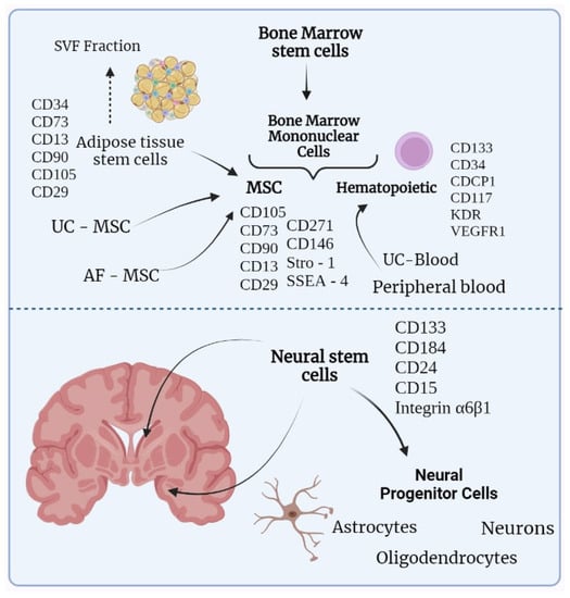 Figure 1 illustrates the different stem cell types and their possible origins, giving preference to stem cells that are related to the treatment of neurological disorders. Bone marrow mononuclear cells (BMMCs) originate from a wider group of bone marrow stem cells BMSC and divide into hematopoietic stem cells and MSCs. Apart from bone marrow, hematopoietic stem cells can be obtained from umbilical cord blood or peripheral blood. From the peripheral blood, stem cells are obtained with the prior mobilization of hematopoietic stem cells from the bone marrow by administrating growth factors. MSCs can be gained from bone marrow, umbilical cord, amniotic fluid, and adipose tissue, with the latter being preferable due to the higher availability of stem cells []. Stromal vascular fraction (SVF) can also be attained from adipose tissue. SVF is a specific extract of adipose tissue, apart from mesenchymal stem cells, contains endothelial cells, pericytes, and lymphocytes. Such a greater variety of stem cells, compared to regular ADSCs, could provide a wider range of therapeutic effects. However, there is a lack of standardization due to high variability between different SVFs []. The lower part of Figure 1 contains neural stem cells that are located in the subventricular zone and the dentate gyrus of the hippocampus. Besides these zones, neural progenitor cells were also found in the periventricular zone of the spinal cord [].