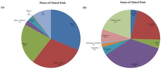 This figure provides a graphical representation of phases and statuses in 492 selected trials. The majority of trials were completed (35%), 21% of trials were recruiting while only 5% were active. We also detected a high percentage of trials with unknown status—20%. 7% of all trials were withdrawn. Phase 1 and phase 2 trials were predominant accounting for 83%. Only 4% of trials were in phase 3 and only 2 trials reached phase 4. (a) Represents phases of the clinical trials and (b) Represents statuses of the clinical trials, NA—not applicable.