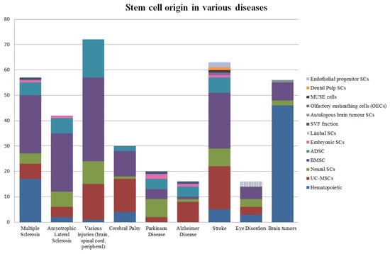 Earlier reviews about stem cell treatments (2011) found 123 mesenchymal stem cell (MSC) clinical trials and only 12 of them were focusing on neurodegenerative disorders []. A 2016 review on MSCs stated that neurological diseases were the second to bone and cartilage diseases in the number of clinical trials (17.8% and 19.1%), outnumbering even cardiovascular diseases. Amyotrophic lateral sclerosis (12 trials), multiple sclerosis (20), and spinal cord injuries (25) were the three most mentioned groups in clinical trials. Parkinson’s, Alzheimer’s, and Duchenne myopathy had only a handful of clinical trials (3 to 4). In total, there were 200 clinical trials on neurological disorders in year 2016 []. A review from 2019 indicates that neurological stem cells (NSCs) were mostly used in stroke (5 trials), while there were only 4 trials each in Parkinson’s disease, lateral sclerosis, multiple sclerosis, and brain tumors. MSCs showed greater numbers in the leading stroke group (27/120) than spinal cord injury (26/120) and multiple sclerosis (23/120). The vast majority of MSCs were said to be from the bone marrow, while adipose-derived stem cells (ADSCs) were in second place and UC-MSCs turned out to be the rarest group among the previous ones. Hematopoietic stem cells were primarily applied only in the cerebral palsy group (17/40) []. In 2021, a review was published focusing on MSCs clinical trials starting from 2015. According to their results, neurological disorders and neurological conditions were the second most popular disease treated with MSCs (61 clinical trials) after bone and cartilage diseases [].