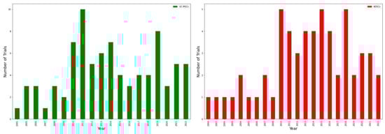 ADSCs and UC-MSCs clinical trials. On the left (green) is a graph for UC-MSCs and on the right (red) for ADSCs. Both are a source for mesenchymal stem cells and have generally similar graphs, and, therefore, approximately the same popularity in the clinic. On the other hand, in 2016 and 2020 there is a drop to three clinical trials for UC-MSCs, while for ADSC’s such drop was registered in 2017 and 2019 (two trials in each year). Overall, UC-MSCs seem to be more frequently applied with the highest peak in 2011 when 10 trials were registered. In turn, ADSCs had three major peaks in 2010 (5 trials), 2015 (5 trials), and 2018 (5 trials).