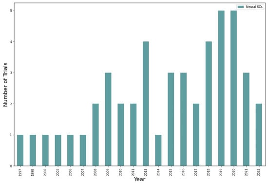 Finally, a bar chart for neural stem cells is provided in Figure 8. The largest number of trials was registered in the 2018–2020 period (from 4 to 5 clinical trials). There was also an increase in 2009, 2015, and 2016 (3 trials in all years) and in 2013 there were 4 clinical trials. However, from 2021 to 2022 a fall in NSC application is observed (from 3 to 2 clinical trials). If we compare the total number of studies, then it is neural stem cells that are used the least often. The maximum number of studies for them is 5. The second and third places in terms of rarity of use are divided between UC-MSCs (maximum 10 clinical trials) and ADSCs (maximum value is 5). The most used neural stem cells are hematopoietic cells (more than 10 clinical studies) and BMSCs (more than 18). The achieved results are in accordance with Figure 3. Overall, there is a remarkable decrease in BMSCs application (Figure 5). There might be a possible increase in UC-MSCs, ADSCs, and hematopoietic stem cells (if we do not consider 2022 year as it is not yet finished) (Figure 6 and Figure 7). Any prognosis for neural stem cells is complicated as it has been falling from 2021 (Figure 8).