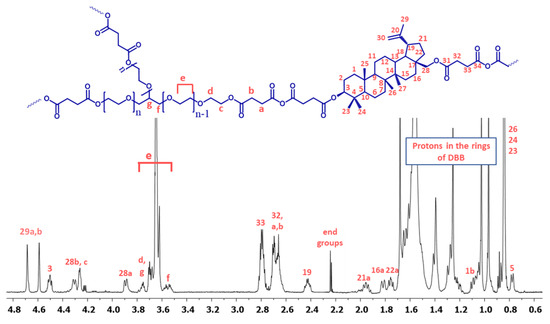 1H NMR (600 MHz, CDCl3, δ): 4.69 (1H, d, C29-Ha); 4.59 (1H, d, C29-Hb), 4.50 (1H, t, C3-Hα); 4.30 (1H, d, C28-Ha); 4.26 and 4.22 (c in PEG); 3.88 (1H, d, C28-Hb); 3.80–3.72 (m, d and g in PEG); 3.72–3.58 (m, (O-CH2-CH2-) in PEG); 3.58–3.50 (m, f in PEG); 2.84–2.74 (4H, m, -OCOOC-CH2-CH2-COO-); 2.74–2.60 (4H, m, -OCOOC-CH2-CH2-COO-); 2.43 (1H, td, C19-H); 2.24 (end groups); 1.96 (1H, m, C21-Ha); 1.82 (1H, d, C16-Ha); 1.76 (1H, t, C22-Ha); 1.68 (3H, s, C30-H3); 1.67–1.54 (7H, m, C15-Ha, C1-Ha, C12-Ha, C13-Ha, C2-Ha,b, C18-H); 1.51(1H, m, C6-Ha); 1.45–1.35 (5H, m, C6-Hb, C11-Ha, C21-Hb, C7-Ha,b); 1.29 (1H, d, C9-H); 1.26–1.17 (2H, m, C11-Hb, C16-Hb); 1.13–1.04 (3H, m, C22-Hb, C12-Hb, C15-Hb); 1.02 (3H, s, C25-H3); 0.97 (3H, s, C27-H3); 0.94–0.92 (1H, m, C1-Hb); 0.88–0.80 (9H, s, C26-H3, C23-H3, C24-H3); 0.78 (1H, d, C5-H).