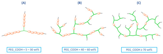 For polyanhydrides containing from 5 to 30 wt% of trifunctional PEG, the predicted structure had the shape of a three-pointed star, in which the PEG molecule was the core and the arms were composed of linked DBB (Figure 6A). The number of DBB molecules per one arm of the PEG was calculated based on NMR spectra and ranges from 10 (DBB_PEG_COOH_5) to 2 (DBB_PEG_COOH_30). As the PEG content increases (40–60 wt%), the structure of the copolymers became increasingly branched (Figure 6B), with 2–3 DBB molecules per one PEG (approximately one DBB per one arm of PEG). For copolymers containing above 70 wt% of PEG_COOH (Figure 6C), the polyanhydrides consist mostly of PEG molecules linked together (with approximately one DBB molecule per one PEG).
