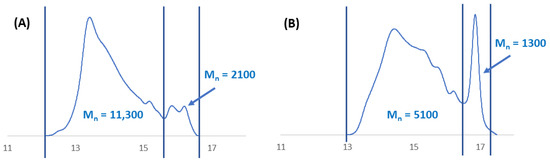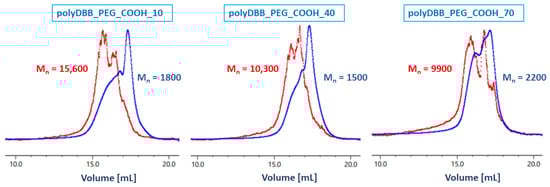 Gel-permeation chromatography (GPC) chromatograms of polyDBB_PEG_COOH_30 (A) and polyDBB_PEG_COOH_60 (B).