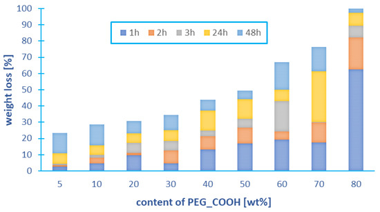 Under physiological conditions, branched polyanhydrides degrade completely in about 24 h. After this time, the complete disappearance of anhydride bonds was observed on the NMR spectra of the degradation samples. The weight loss of the tested samples was dependent on the PEG_COOH content in polyanhydrides. After 48 h, the weight loss of copolymers containing up to 30 wt% of PEG was below 40% (w/w), which was due to the poor solubility of the degradation product (betulin disuccinate) in PBS. The degradation rate of the polyanhydrides increases strongly with the increased PEG_COOG content in the polyanhydrides, which is due to their increased hydrophilicity. The highest weight loss was observed for the copolymer containing 80 wt% of PEG (100% (w/w)).