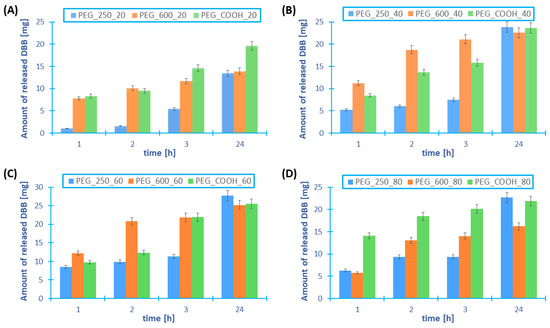 Comparison of the amount of DBB released from branched and linear copolymers, in which the PEG content is, respectively, 20 wt% (A), 40 wt% (B), 60 wt% (C), and 80 wt% (D) (n = 3, error bars, standard deviation).