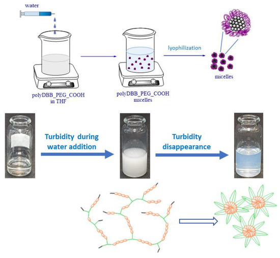 The micelles fabricated from branched polyanhydrides based on DBB and PEG (polyDBB_PEG_COOH) were prepared by adding water via a syringe into a solution of polyDBB_PEG_COOH in tetrahydrofuran (12.5 mg/mL). The amount of added water depended on the PEG_COOH content in polyanhydride. When water was added, the turbidity first appeared, which then gradually disappeared until an opalescent solution was obtained. The observed changes indicate the formation of micellar structures. After that, the micelles were lyophilized and stored in a freezer.