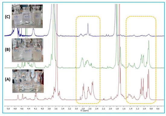 Micellization process observed by NMR spectroscopy: (A) solution of copolymer in THF; (B) appearance of turbidity and (C) opalescent solution.