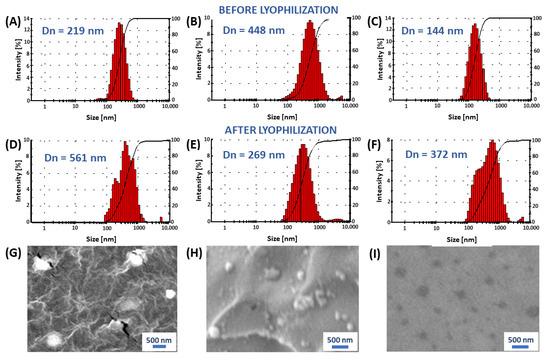 The size distribution of micelles before lyophilization: from polyDBB_PEG_COOH_40 (A), polyDBB_PEG_COOH_60 (B) polyDBB_PEG_COOH_80 (C); after lyophilization: from polyDBB_PEG_COOH_40 (D), polyDBB_PEG_COOH_60 (E), polyDBB_PEG_COOH_80 (F) and their morphologies after lyophilization (G–I) characterized by SEM.