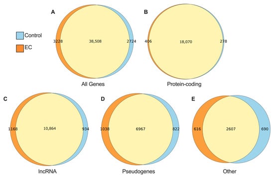 Venn diagrams summarising genes by biotype in EC and control tissue from obese women. Presented are the (A) total genes regardless of biotype; (B) protein coding genes; (C) long non-coding (lncRNA); (D) pseudogenes; and (E) other. Numbers within Venn diagrams display the number of genes common to both EC and control (overlapping circles in yellow), unique to EC (orange), and unique to control tissue (blue).