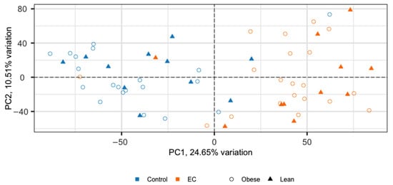 The top 1000 genes from the obese and lean cohort, sorted by fold change, were subjected to principal component analysis (PCA). A separation between EC and the control tissue can be observed (Figure 2). Principal component 1 (PC1) captured 24.65% variance and PC2 captured 10.51% variance between EC and the control tissue. There was no obvious separation between obese and lean cohorts in the PCA.