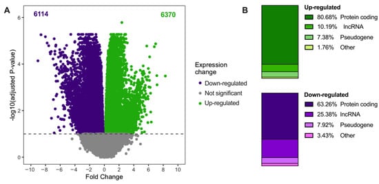 Differential expression analysis between EC and control tissues from the obese cohort. (A) Volcano plot of differentially expressed genes. The x-axis is the fold-change in gene expression between EC and control tissues and the y-axis is the log10 (adjusted p-value). Green, purple, and grey dots represent up-regulated, down-regulated, and non-differentially expressed genes in EC, respectively. (B) Stacked bar charts show the percentage of each biotype of up-regulated genes in shades of green and down-regulated genes in shades of purple.