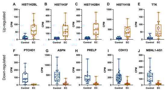 Expression patterns of selected differentially expressed gene between control and EC samples from the obese cohort. Scatter plots and box and whisker plots present expression levels in counts per million (CPM) for EC compared to control tissue with boxes denoting the interquartile range (IQR), median represented by horizontal bar within the IQR, and vertical bars indicating minimum and maximum values. (A–E) Expression patterns of the top five up-regulated genes in EC and (F–J) top five down-regulated genes in EC by adjusted p-value. The y-axis shows gene expression in CPM, dots indicate the individual sample expression values for EC (blue) and control tissue (orange).
