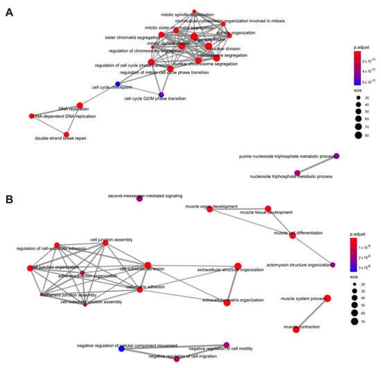 The top 1000 up-regulated and top 1000 down-regulated protein coding genes in EC tissue from obese women were selected by the adjusted p-value for a GO enrichment analysis (Figure 5). The enrichment pathways for up-regulated genes showed the enrichment of biological processes related to chromosome segregation, nuclear division, mitotic nuclear division, organelle fission, and nuclear chromosome segregation. Down-regulated genes enrichment categories were related to extracellular matrix organisation, cell-substrate adhesion, the muscle system process, muscle contraction, and extracellular structure organisation. A full list of enrichment gene ontology categories for up-regulated and down-regulated genes, respectively, is shown in Tables S9 and S10. Similar GO pathways were enriched in the differentially expressed genes from the lean cohort (Tables S11a and S12a for up- and down-regulated genes, respectively. Figures S11b and S12b for up- and down-regulated genes respectively). Further, similar GO pathways were observed in the TCGA datasets in Tables S13a and S14a and Figures S13b and S14b for up- and down-regulated genes, respectively.