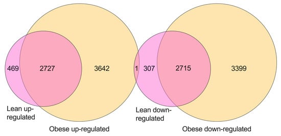 Venn diagram of differentially expressed genes (up- and down-regulated) across obese and lean cohort of women.
