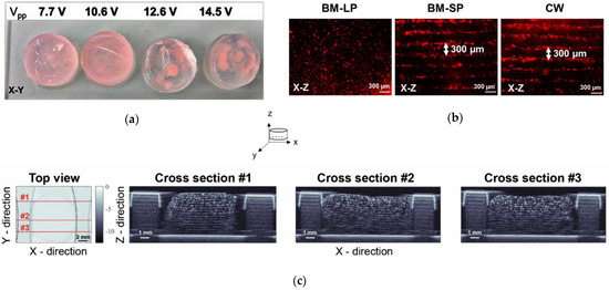 (a) Photographs of hydrogels from the top (X-Y) at increasing transmission peak-to-peak voltage (Vpp); (b) fluorescence images of red beads (12 µm) patterned at different ultrasound wave modes, where BM-LP, BM-SP and CW stand for ultrasound burst mode short pulses, burst mode long pulses and continuous wave, respectively; (c) SAM200Ex C-scan mode acoustic microscopy images of patterned fibrin gels at three different X-Z projections. The representative images are of the experiments repeated three times.