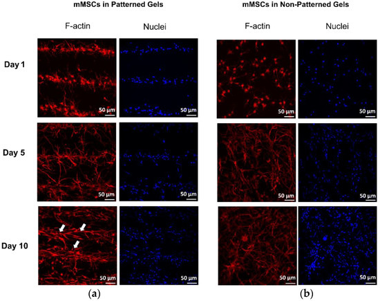 (a) mMSCs organized in fibrin hydrogels preserved a layered structure within 10 days of culturing in osteogenic degradation-free media with aprotinin (OMA); (b) filamentous actin (F-actin) bundles appear thicker and more intensive in the patterned gels (white arrows) in comparison to the thin and diffuse fibers in non-patterned gels.