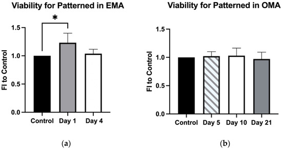 Cell viability of mMSCs measured by Presto Blue assay in patterned and non-patterned gels, cultured either in expansion degradation-free media with protinin (EMA) (a) or osteogenic degradation-free media with aprotinin (OMA) (b). * represents p ≤ 0.05. FI stands for fold induction compared to control (non-patterned gels).