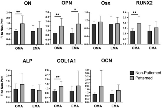 The enhanced expression of osteogenic markers, i.e., ON, OPN, COL1A1, and RUNX2 (Figure 4), in the patterned constructs cultured in the osteoinductive media (OMA) was observed on day 5. Interestingly, OPN gene expression was also up-regulated in patterned gels cultured in non-osteogenic conditions (EMA), suggesting that the patterning alone has a pro-osteogenic influence. Two-way ANOVA analysis also revealed an effect of cells organized in a patterned manner on the expression of the OCN gene (p = 0.0460). However, the pairwise comparison did not confirm any statistically significant changes.