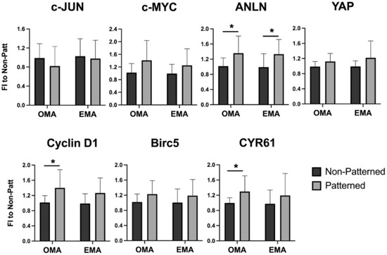Genes influencing cell cycle progression, i.e., Cyclin D1, anillin (ANLN), and cysteine-rich angiogenic inducer 61 (CYR61), were also affected by patterning (Figure 5) in the osteogenic media OMA, and ANLN was also enhanced in the expansion media EMA. Two-way ANOVA analysis showed that the cell patterning had a significant effect on the expression of MYC proto-oncogene protein (c-MYC) and yes-associated protein (YAP) genes, p = 0.0408 and p = 0.0494, respectively. However, the pairwise comparison did not result in statistical significance. The expression of early-response transcription factor JUN (c-JUN) and baculoviral IAP repeat containing 5 (Birc5) survival genes was not influenced by the cell organization.