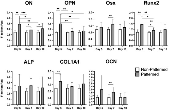 The degradation-free osteogenic media (OMA) was then selected for long-term culturing of the patterned constructs at additional time points. Days 7 and 10 were chosen to monitor the progression. The most pronounced effects for all genes showing elevated expression in patterned hydrogels were observed on day 5 (Figure 6). Osx, RUNX2, and OCN were also slightly but significantly enhanced on day 7, and only the ON gene was augmented at every time point. Two-way ANOVA analysis showed a statistically significant effect (p = 0.0452) of patterning on the gene expression of ALP; however, this was not observed for pairwise comparison.